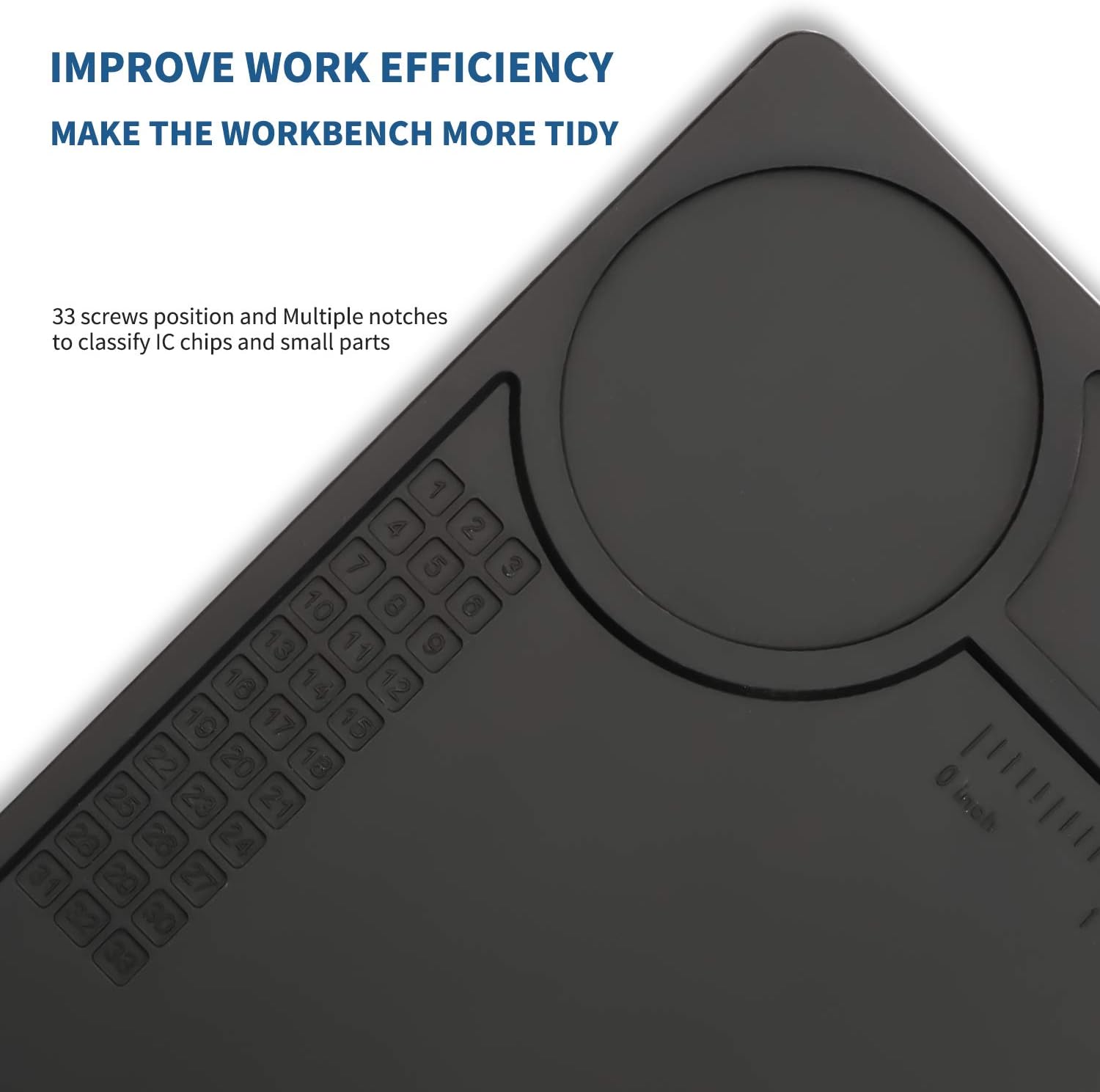 Cuenta con un tamaño total de 14 x 10 pulgadas y un área útil de trabajo de 13.3 x 8.2 pulgadas, ofreciendo mayor comodidad para la reparación de dispositivos electrónicos de diferentes tamaños.