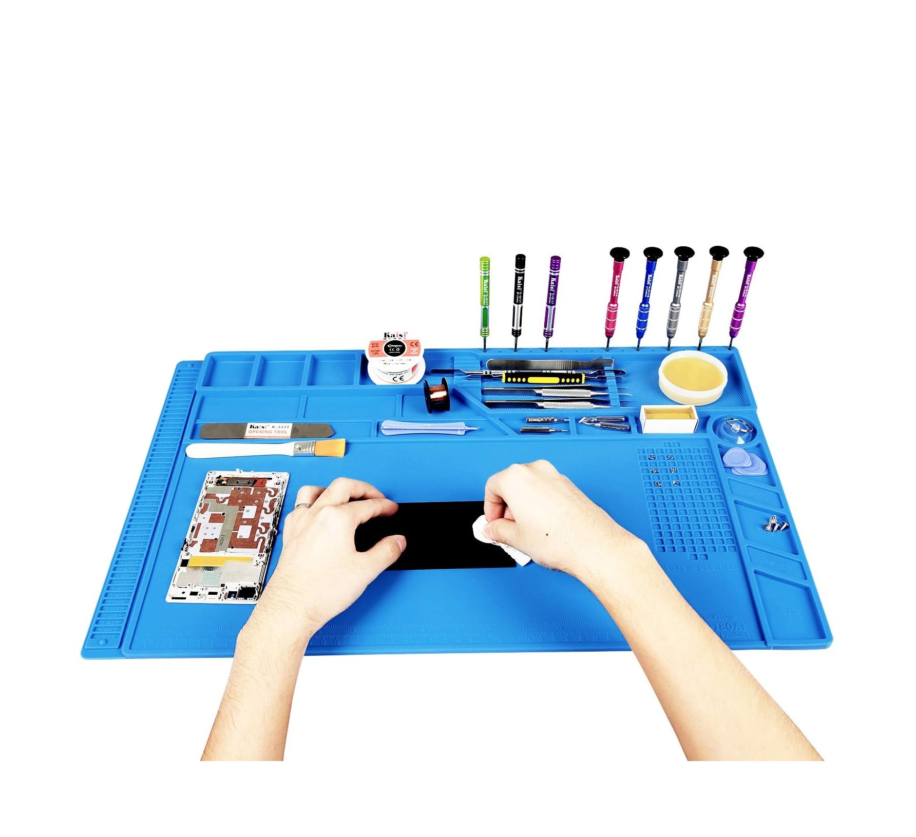 Con un tamaño de 21.6 x 13.8 pulgadas (55 x 35 cm), ofrece un área de trabajo amplia que facilita la reparación de dispositivos grandes como laptops, computadoras, consolas, tablets, placas electrónicas y múltiples componentes simultáneamente.