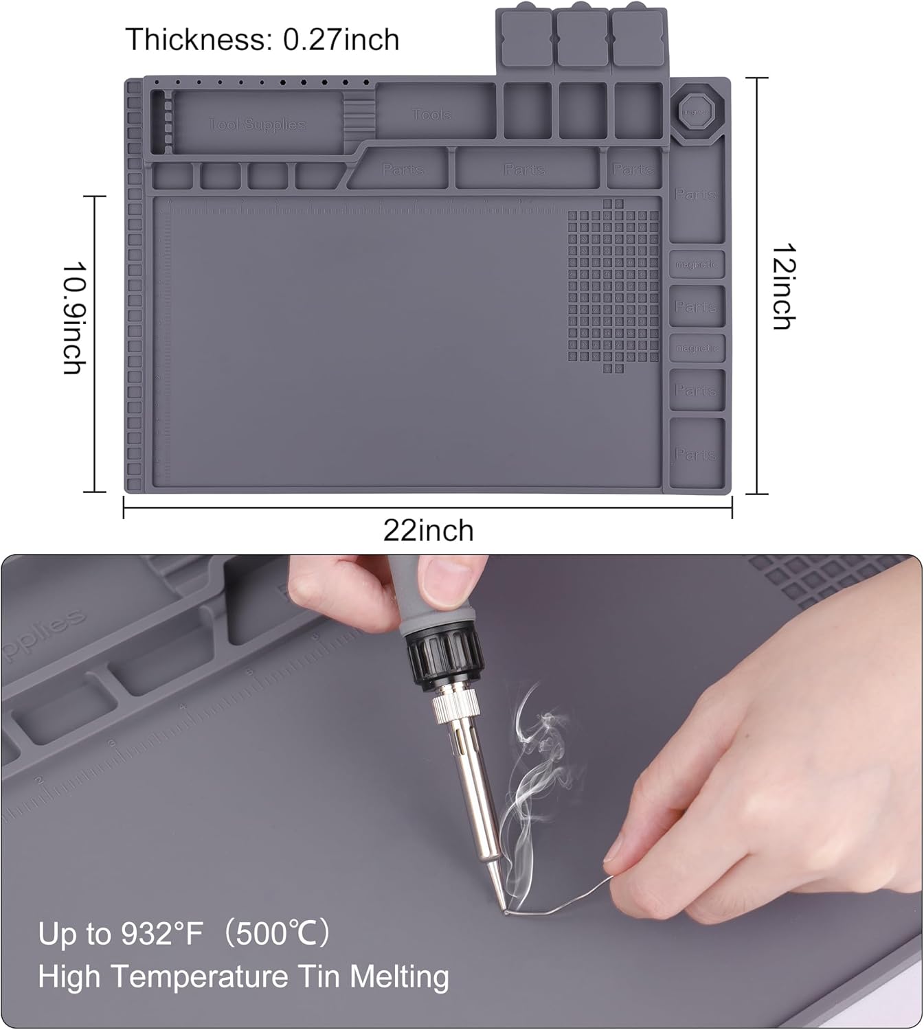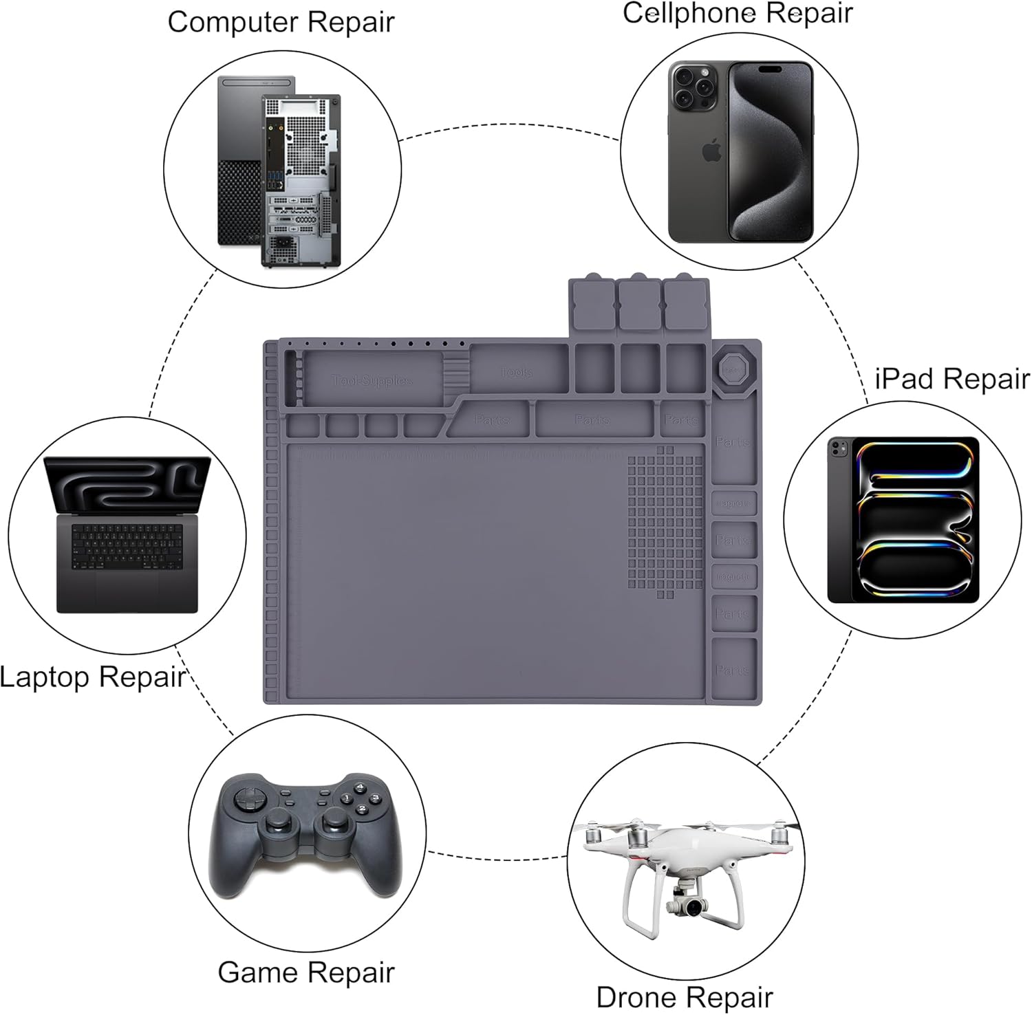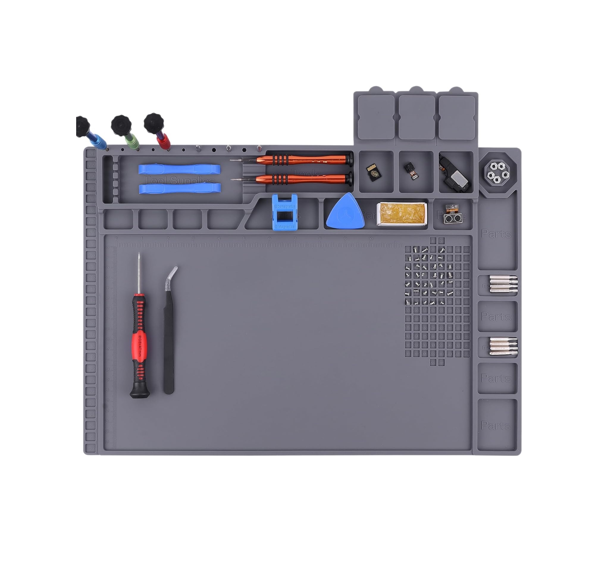 Con un tamaño de 17.3” x 11.8” (44 x 30 cm), ofrece un espacio cómodo y amplio para múltiples proyectos, permitiendo trabajar con placas electrónicas, teléfonos móviles, laptops, cámaras, relojes inteligentes, consolas, juguetes electrónicos y más.
