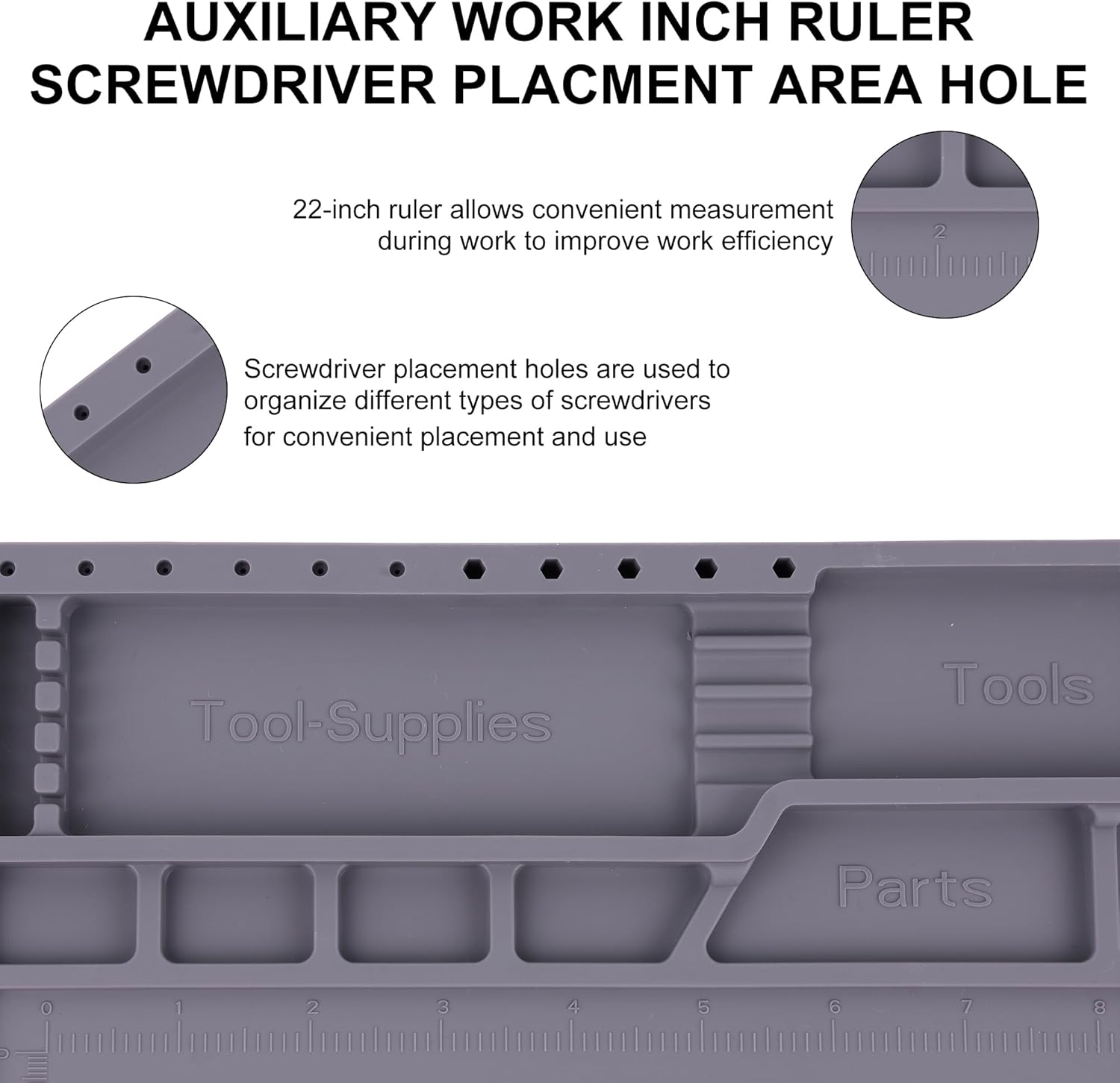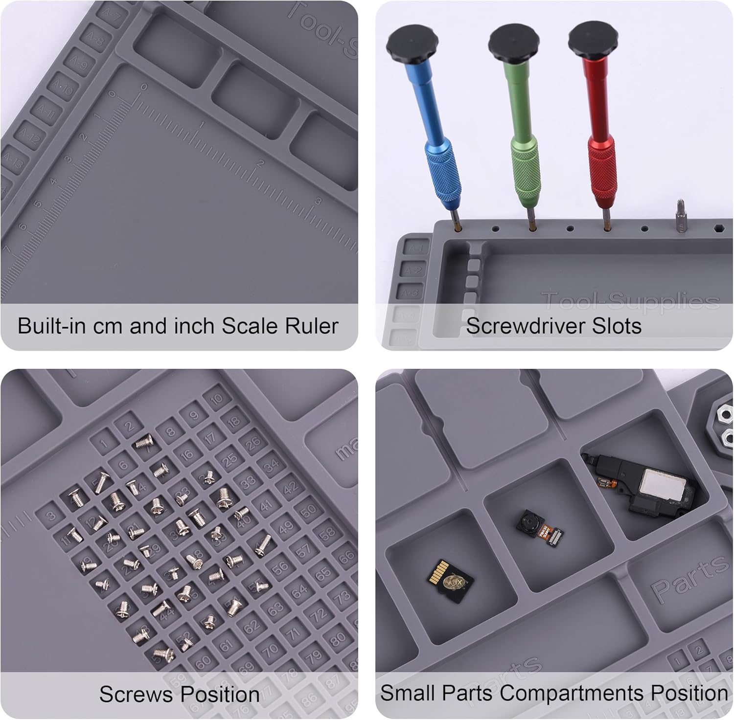 Su diseño inteligente incorpora compartimentos, bandejas y zonas magnéticas que facilitan la organización de tornillos, componentes pequeños y herramientas, evitando pérdidas y aumentando la eficiencia durante las reparaciones.