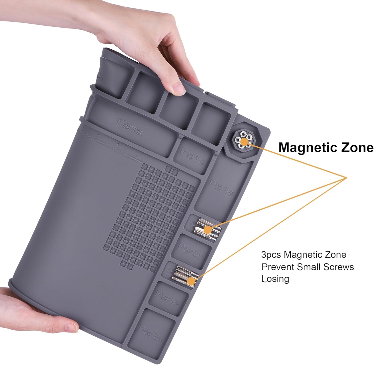 Incluye áreas magnéticas integradas que mantienen tornillos y piezas pequeñas en su lugar, evitando desorden, extravíos y facilitando el montaje y desmontaje de dispositivos electrónicos.