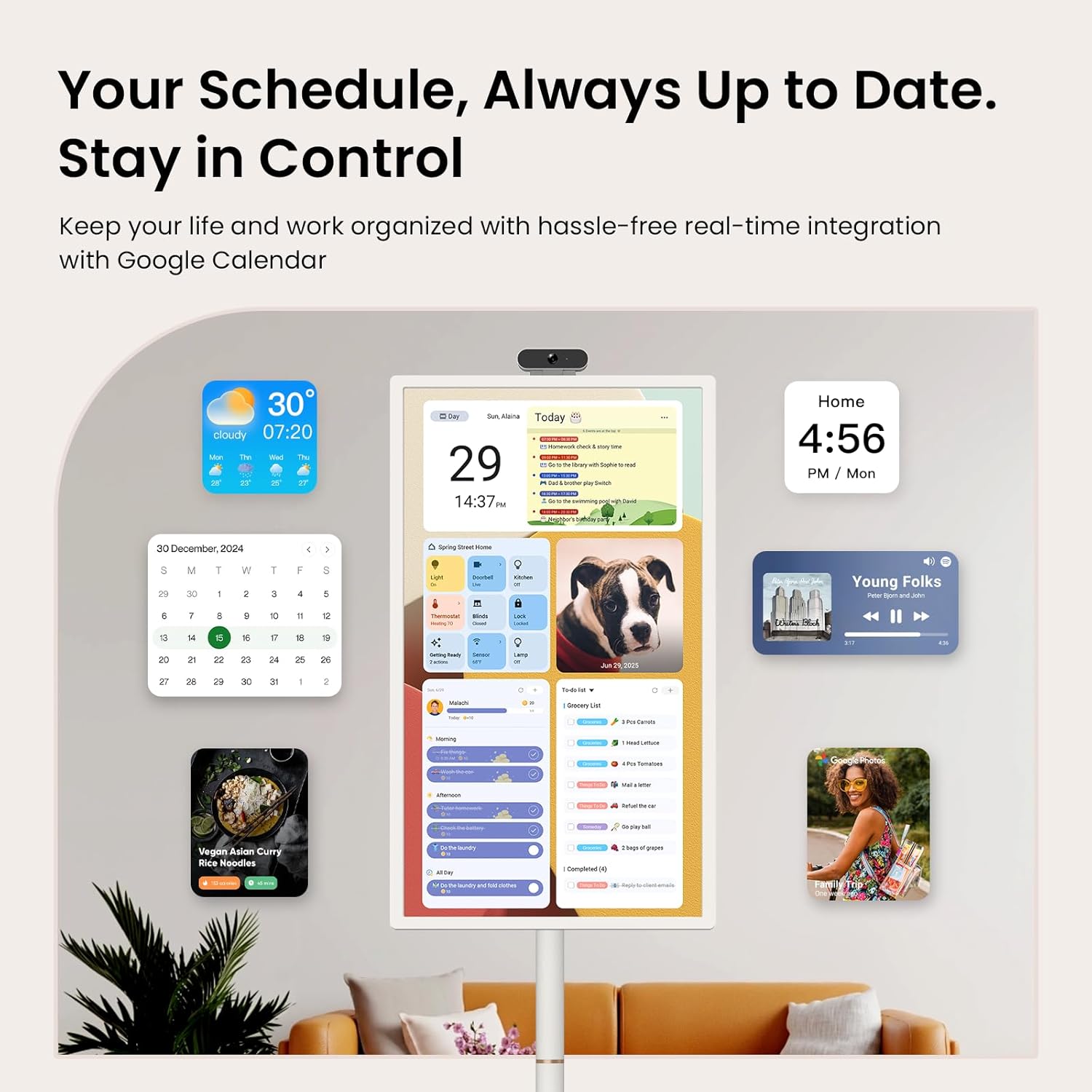 El soporte del televisor incluye cinco ruedas silenciosas que permiten mover el dispositivo fácilmente entre habitaciones. Además, la pantalla puede girar, inclinarse y ajustarse en altura para adaptarse a diferentes posiciones, ya sea para ver películas, cocinar siguiendo recetas, practicar ejercicios o realizar videollamadas.
