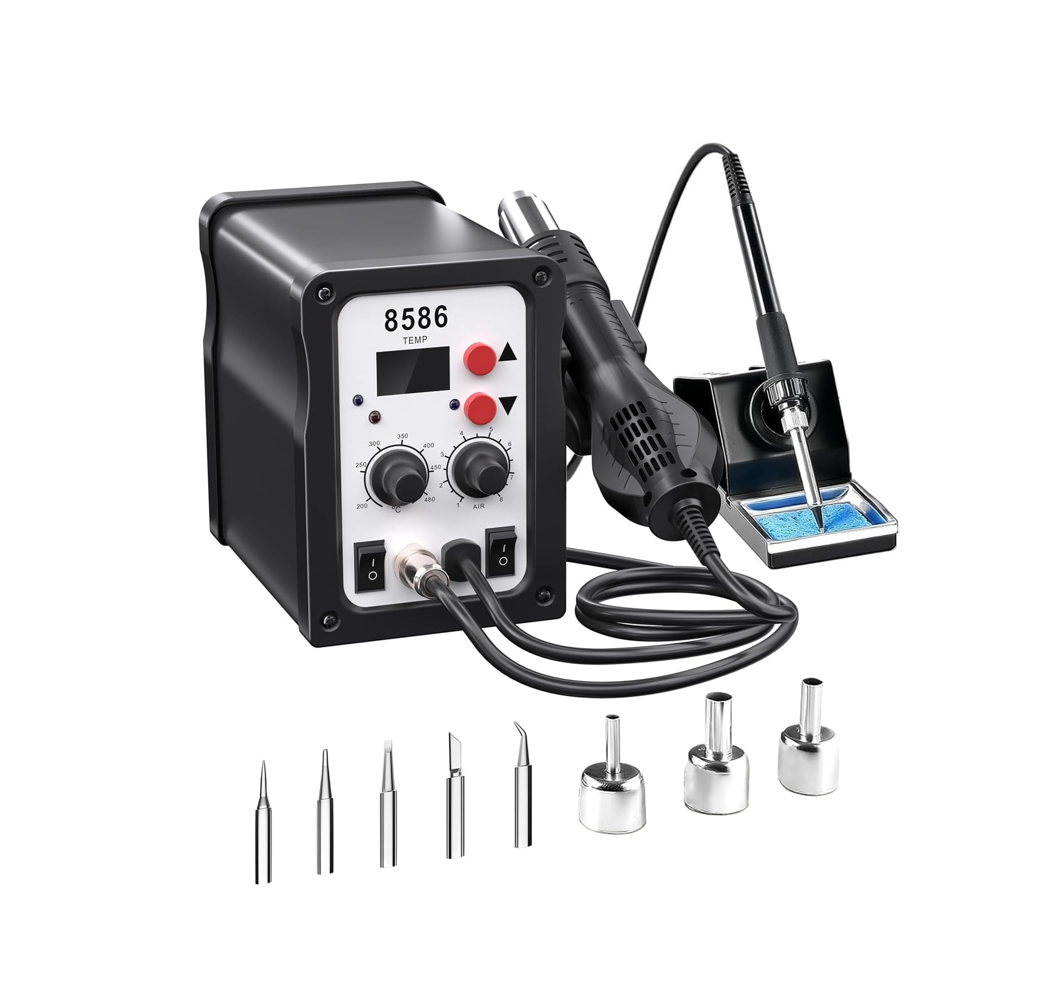 La Estación de Soldadura 2 en 1 de 700W combina un soldador y una pistola de aire caliente en un solo equipo, ideal para reparaciones electrónicas profesionales o de bricolaje. Equipada con pantalla LED y control de temperatura PID, ofrece precisión, seguridad y eficiencia en cada trabajo.