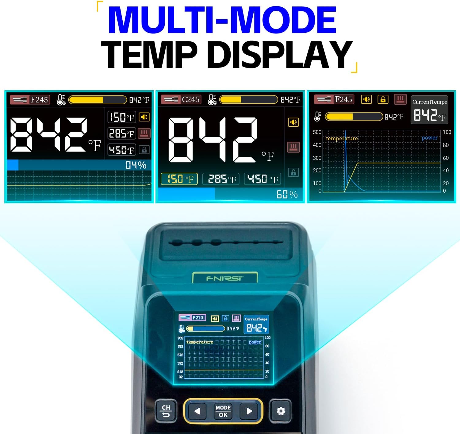 Equipada con una pantalla de alta definición de 2.8 pulgadas, ofrece tres modos de visualización: valor de temperatura, curva térmica y modo combinado. Permite monitorear el comportamiento térmico en tiempo real y almacenar hasta 3 perfiles personalizados para ajustes rápidos.