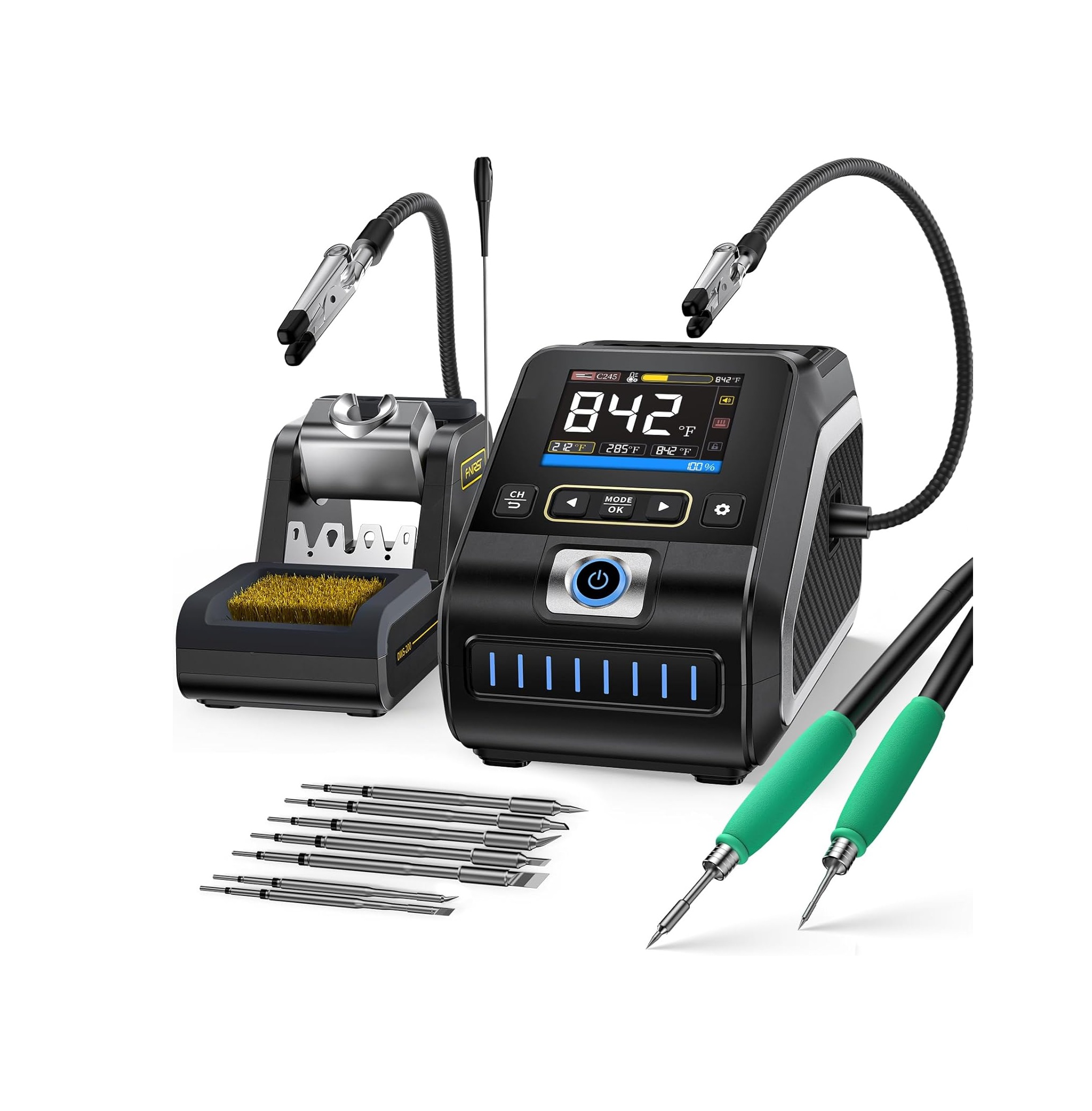 Incluye mangos F210 y F245 con un total de 9 puntas intercambiables, permitiendo abordar trabajos de alta precisión SMD y tareas que requieren mayor potencia térmica. Las 2 manos de ayuda con clips ajustables en 360° brindan una fijación firme para mayor comodidad y exactitud.