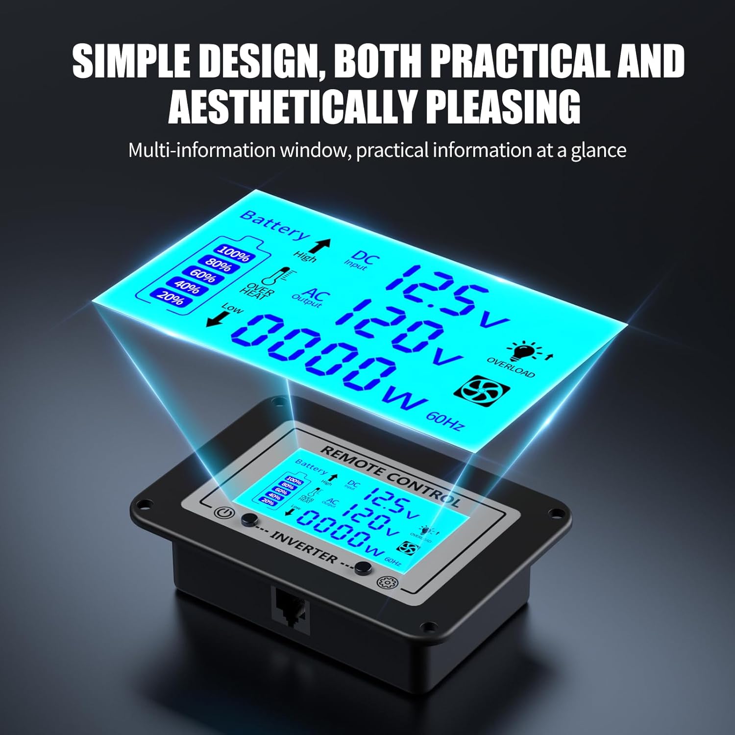 📟 Incluye una pantalla LCD de alta calidad que muestra el voltaje de entrada/salida, nivel de batería y estados de protección. Su control remoto permite encender o apagar el inversor sin necesidad de acceder directamente al dispositivo.