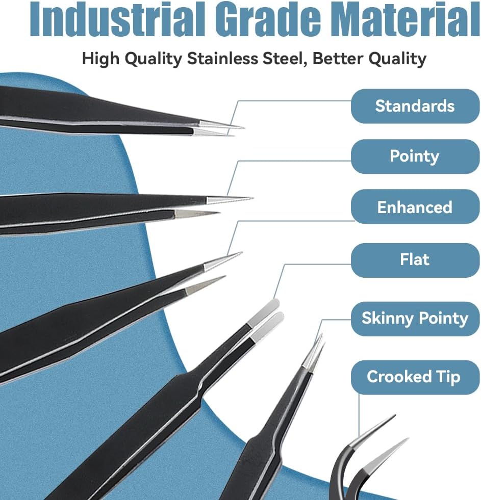 🔧 El juego de 6 pinzas de precisión CHERALKEST está diseñado para ofrecer la máxima exactitud en trabajos delicados. Fabricadas en acero inoxidable de alta calidad con recubrimiento ESD antiestático, son ideales para electrónica, manualidades, joyería y laboratorios 🛠️✨.