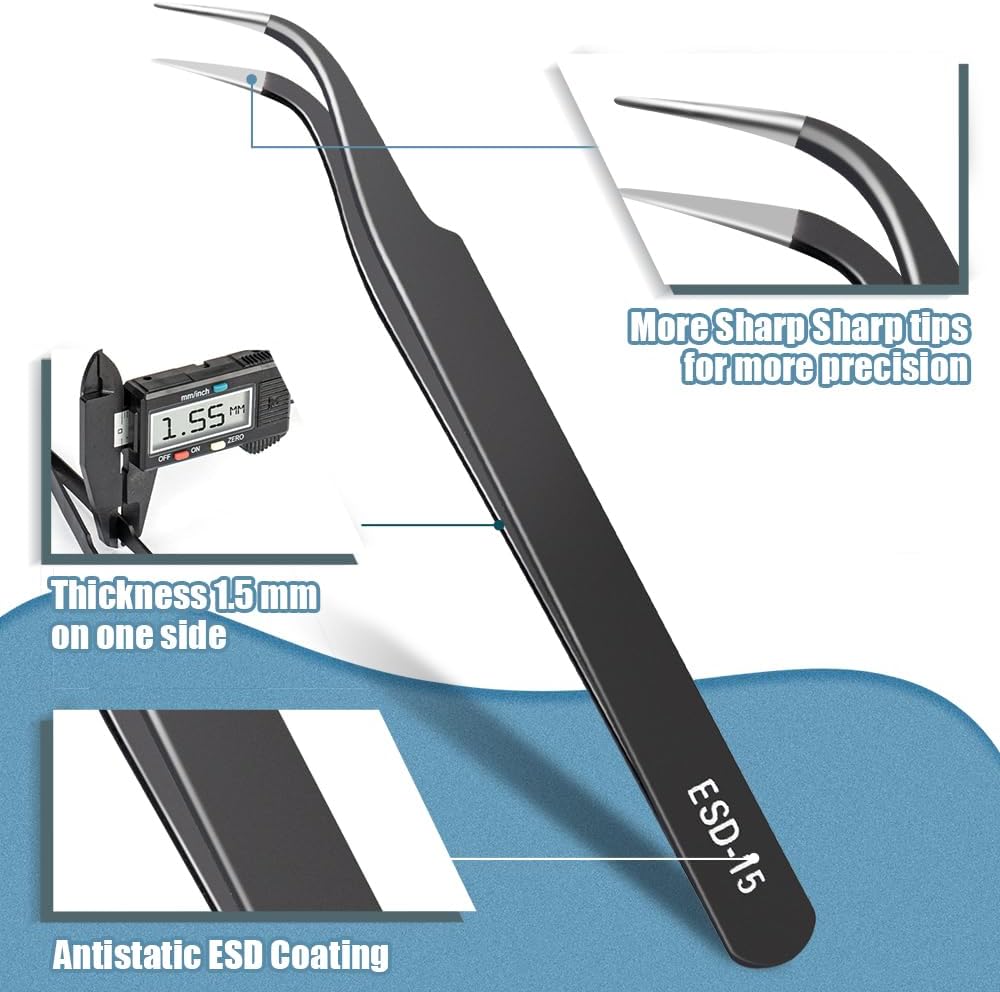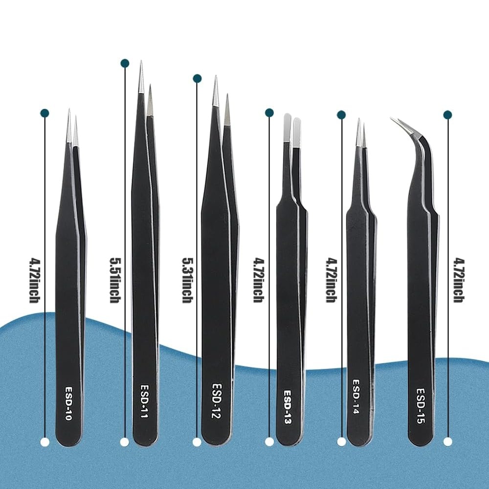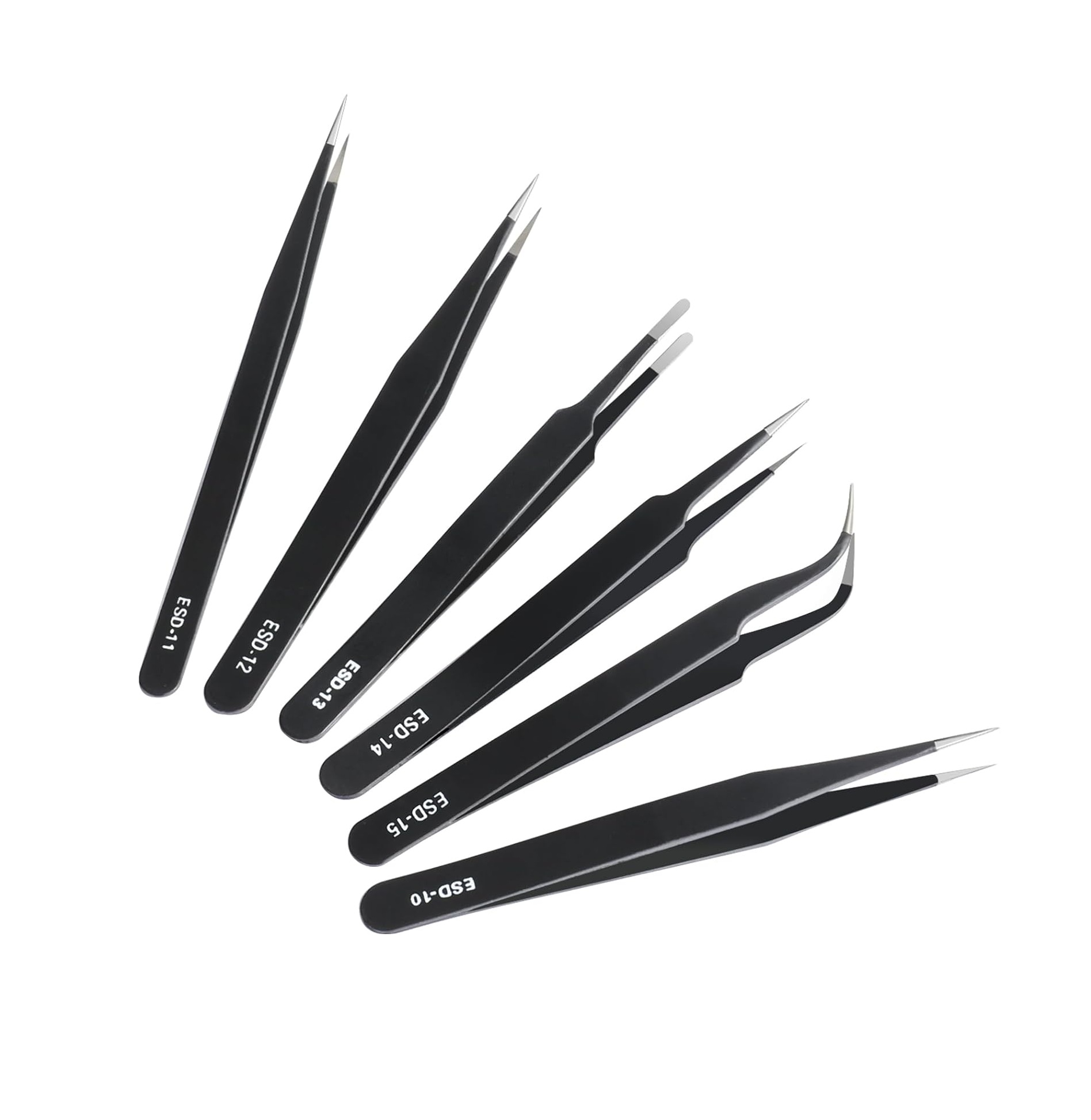 - 6 x Pinzas de precisión ESD (diferentes formas: rectas, curvas, finas)