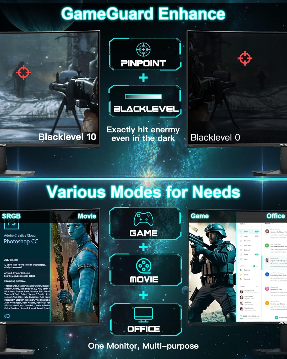 • 🎮 Optimizado para gamers: modos FPS, RTS y Racing con asistente de juego (nivel negro, punto de mira, temporizador y contador).