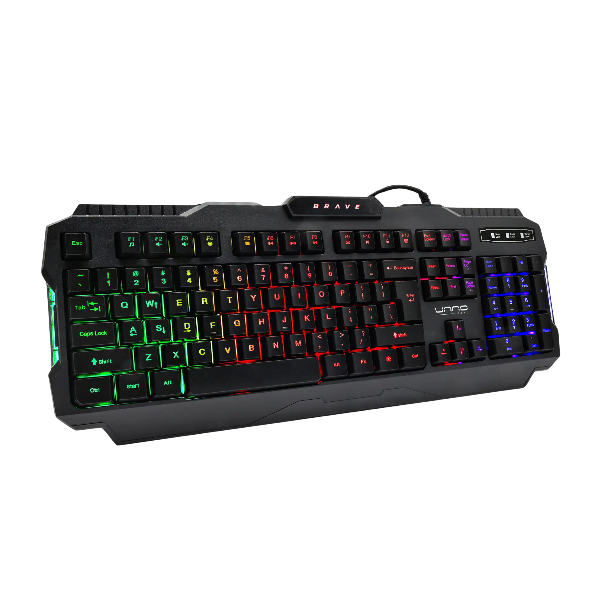 – 104 teclas con fondo de led efecto arco iris y letras iluminadas.