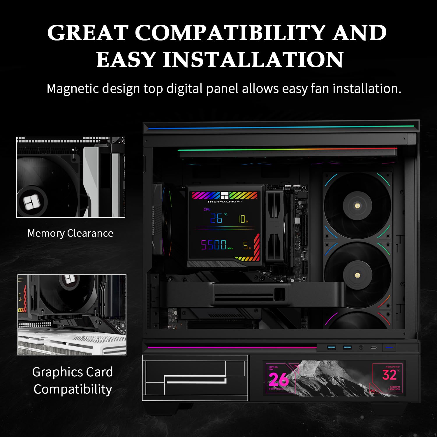 - 🌈 ARGB + Pantalla digital: cubierta superior magnética con tablero que muestra temperatura y uso de CPU/GPU, sincronizable con el software TRCC.